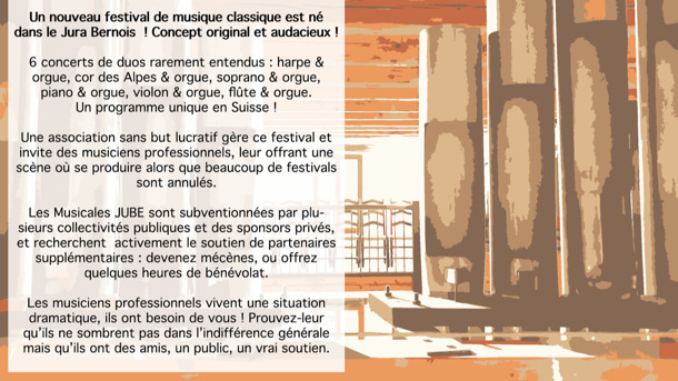 Cette somme couvrira le cachet des musiciens du 1er concert des Musicales JUBE: violon & orgue, par Eva et Martin Kovarik, domiciliés dans le canton de ZH.