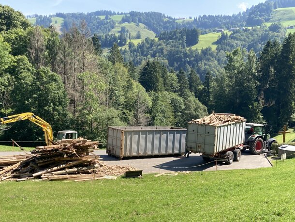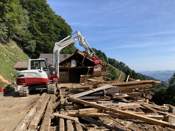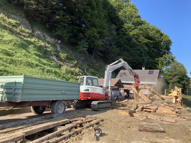 Diese Woche wurden mit den Vorbereitungsarbeiten und dem Abbruch des Alpstalls auf der Meiersalp begonnen. Dank gutem Wetter kamen die Arbeiten gut voran. In 2 Tagen haben Mitglieder vom LVU Untertoggenburg mit ihren Traktoren und Martin Kurath, Baggerunternehmen, Libingen den Alpstall fachmänisch abgebrochen und und auf dem Parkplatz in Libingen das Bauholz in Grosscontainer verladen und entsorgt. Vielen Dank allen Helfern!