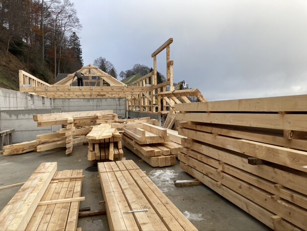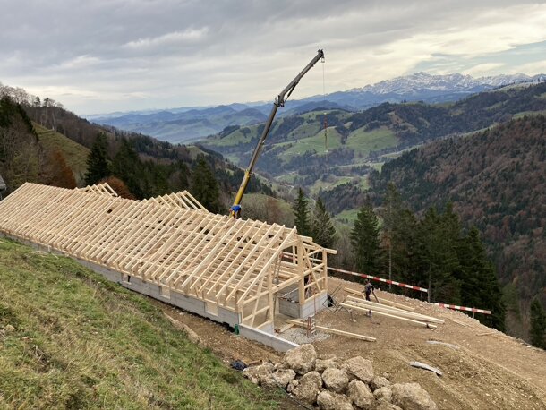 Diese Woche wurde der Alpstall auf der Meiersalp durch Fitze Holzbau AG, Egg- Flawil sowie Hollenstein Holzbau AG, Libingen aufgerichtet. Diese Holzkonstruktion macht dem Zimmermannsberuf alle Ehre. Durch den tollen Einsatz der Zimmerleute und deren Handlangern ist die Arbeit vom Abbinden bis zum Aufrichten fehlerfrei und mit grosser Sorgfallt ausgeführt worden. Bravo, Herzliche Gratulation!! Mit dem Anschlagen des Aufrichtbäumchen wurde diese Arbeit auch mit einer schönen Tradition Abgeschlossen. Herzlichen Dank an Alle.