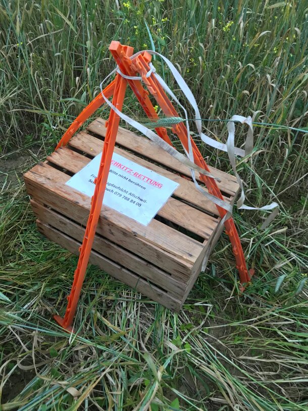 Jäger und Helfer waren rasch im Einsatz und das niedliche Kitz konnte direkt neben der Wiese solange unter einer Harasse in Sicherheit gehalten werden, bis die Wiese gemäht war.