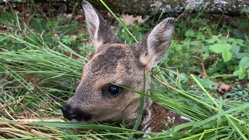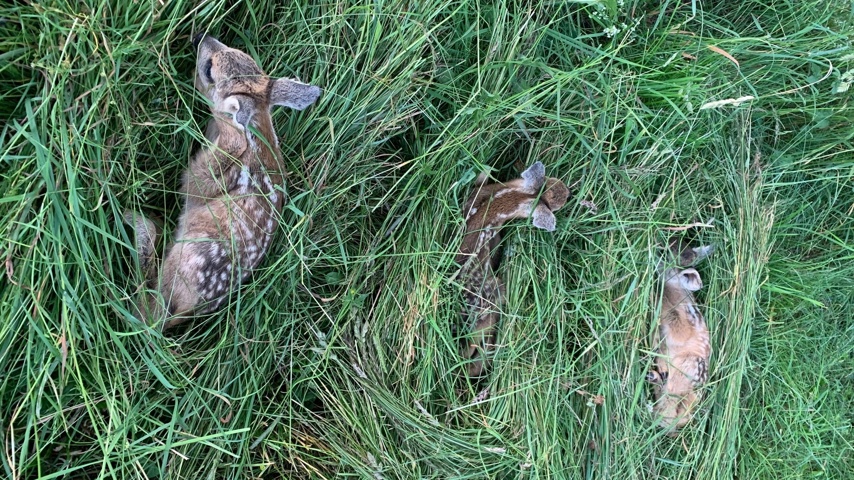 Rehkitze haben in den ersten Lebenswochen einen "Duckreflex". Das heist, wenn der Landwirt das Feld mäht, besteht für ein kleines Reh so gut wie keine Überlebenschance.