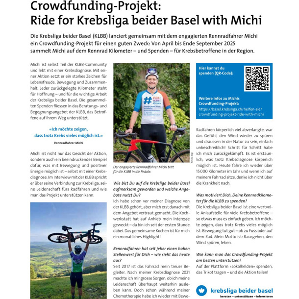Von April bis Ende September 2025 sammelt Michi auf dem Rennrad Kilometer – und Spenden – für Krebsbetroffene in der Region. Michi ist Teil der KLBB-Community und lebt mit einer Krebsdiagnose. Mit seiner Aktion setzt er ein starkes Zeichen für Lebensfreude, Sport und Zusammenhalt. Die gesammelten Spenden fliessen in das Beratungs- und Begegnungsangebot der Krebsliga beider Basel, das Betroffene auf ihrem Weg unterstützt. Michi ist nicht nur das Gesicht der Aktion, sondern auch ein beeindruckendes Beispiel dafür, was mit Bewegung und positiver Energie möglich ist – selbst mit einer Krebsdiagnose. Im Interview spricht er über seine Verbindung zur Krebsliga, seine Leidenschaft fürs Radfahren und wie man das Crowdfunding-Projekt unterstützen kann. Das ganze Interview findest Du im Birs Magazin Seite 42: https://issuu.com/regio-aktuell/docs/birsmagazin_02_25?fr=sNjA3NzgzNzE3ODc