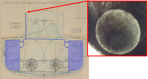 Im Jahr 1920 wurde das DS Säntis als erstes Schiff am Bodensee auf Ölfeuerung umgestellt, wobei das System Omega der Zürcher Firma Lipinski & Co verwendet wurde, das einen Niederdruck-Zerstäubungsbrenner einschloss. Diese Umstellung ermöglichte es, die Besatzung um eine Person zu reduzieren. Als Konsequenz wurden die Kohlenbunker in Treibstofftanks umgewandelt, und es wurden zusätzlich für die beiden Brenner je ein Tagestank installiert. Diese Tagestanks wurden höher im Schiff platziert, um einen hydrostatischen Druck zu erzeugen, der den Tagesverbrauch abdecken konnte. Dies musste jedoch so gestaltet werden, dass der Schwerpunkt des Schiffes nicht zu hoch lag, da dies die metazentrische Höhe (GM) verringert und die Stabilität des Schiffes beeinträchtigen kann. Während der Vorbereitungen für diese Anpassung im Jahr 1919 wurde eine Zeichnung erstellt, um die Stabilität des Schiffes zu bewerten. Sobald die Stabilitätskriterien mit den neuen Tanks erfüllt waren, beauftragte man die Zürcher Firma Lipinski & Co damit, detaillierte Zeichnungen der Tanks anzufertigen. Durch geschickte Gestaltung konnte die Einbauhöhe des Tagestanks so angepasst werden, dass er immer noch in den Maschinenraum passte. Diese Tanks wurden im stärksten Teil des Schiffes platziert, da zahlreiche Verstärkungen der Längs- und Querverbände diesen Abschnitt des Schiffes äusserst robust machten. Ein Schiff muss aufgrund der Wellenkräfte, die auf den Rumpf einwirken, die Fähigkeit haben, sich zu verbiegen. Im Schiffbau ist es jedoch üblich, den Maschinenraum zusätzlich zu verstärken, um das Gewicht des Motors und die Kräfte des Vortriebs optimal im Rumpf zu verteilen. Während dies bei modernen Frachtschiffen normalerweise am Heck geschieht, befand sich dieser verstärkte Bereich bei der DS Säntis im Mittelschiff, genau dort, wo sich auch die Treibstofftanks befinden. Zusätzlich sind die Tanks nicht an der Aussenhülle befestigt (man spricht von Doppelwand), was ein Sicherheitsvorteil ist, der bei modernen Schiffen erst seit wenigen Jahren vorgeschrieben ist. Das bedeutet, dass eine Beschädigung der äusseren Hülle nicht zwangsläufig eine Beschädigung des Treibstofftanks zur Folge hat. Ausserdem wurde die Schiffshülle der DS Säntis durch den Radkasten zusätzlich geschützt. Die Tanks benötigen für den Druckausgleich eine Tankbelüftung. Während bei modernen Fahrzeugen keine Leitungen direkt in die Atmosphäre führen dürfen, war dies 1920 nicht der Fall. Gemäss dem Hersteller sollte die Lüftungsleitung einfach drei Meter in die Höhe in die Atmosphäre führen. Zwischen den vier Tanks und der Atmosphäre waren keine Ventile eingebaut. Als das Schiff 1933 sank, konnte Seewasser ungehindert durch die Tankbelüftung in die vier Tanks eindringen, da das Schiff aufrecht auf dem Seegrund stand und die Dichte (das Gewicht) des Treibstoffs geringer ist als das von Wasser, führte dies dazu, dass alle Treibstoffreste, die noch in den Tanks vorhanden waren, sich im Seewasser auflösten. In einem komplexen Vorhaben ist es dem Schiffsbergverein gelungen, mit zwei Tauchrobotern gleichzeitig in das Wrack einzudringen. Dies war notwendig, um die Tankbelüftung zu lokalisieren. Wie bei vielen anderen Leitungen, die zum Oberdeck führten, wurde auch diese Leitung abgeschnitten. Damit konnte nachgewiesen werden, dass Seewasser ungehindert in die Treibstofftanks eindringt und ein regelmässiger Austausch stattfindet. Daher ist der Beweis erbracht, dass das maximale Treibstofftankvolumen von 6280 Litern in den vier Tanks vollständig geflutet wurde und sämtliche Treibstoffreste sich aufgrund der kontinuierlichen Wechselwirkung mit dem Seewasser aufgelöst haben. Des Weiteren ergab das Schwermetallscreening und die Kohlenwasserstoffanalyse der Bodenprobe, die mit Kurzkerngeräte der ETH Zürich entnommen wurde, keine Gefahren für die Umwelt. Es besteht also derzeit keine Bedrohung für die Umwelt, auch da die Bleimennigfarbe immer noch fest mit dem Stahl verbunden ist.