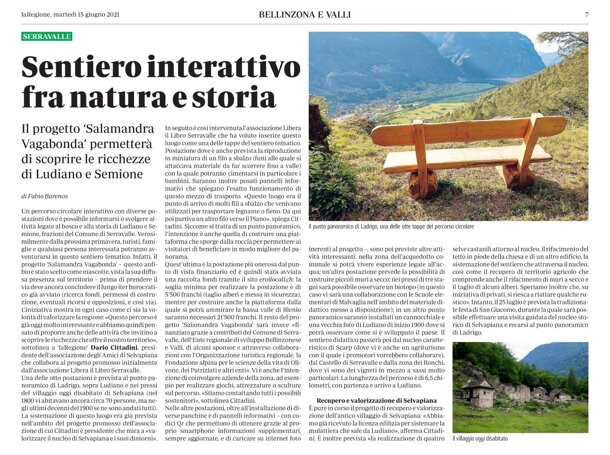 Cari amici della piccola Salamandra Vagabonda, grazie al vostro prezioso contributo (chi in soldi, chi con il lavoro durante la giornata di sabato 12 giugno) il progetto per il sentiero tematico che va da Ludiano a Selvapiana per poi scendere al Castello di Serravalle passando da Scarp (Semione) sta facendo grandi passi avanti. Negli scorsi giorni sul quotidiano La Regione è apparso un bel articolo che presenta il progetto e rende pubblico quanto stiamo facendo. In queste settimane abbiamo preso contatto con vari enti (Patriziati, Ente Regionale di Sviluppo Bellinzona e Valli, OTR Bellinzonese e Alto Ticino e altri ancora.) i quali si sono detti entusiasti di questa iniziativa rivolta a rendere ancora più attrattiva la Valle di Blenio. Questo ci ha fatto molto piacere e ci ha spronati ad andare avanti in quest'avventura... Vi ringraziamo di cuore per la vostra partecipazione e il vostro sostegno e vi chiediamo di continuare a parlare di questo progetto con i vostri amici e conoscenti così da trovare nuovi sostenitori. Restiamo volentieri a vostra disposizione per ulteriori informazioni. Vi auguriamo una splendida estate e al prossimo aggiornamento sul progetto Salamandra Vagabonda. Il gruppo promotore