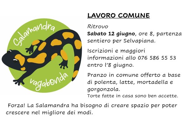 Cari sostenitori, ci permettiamo di aggiornarvi sul progetto del sentiero tematico "Salamandra Vagabonda" che assieme all'associazione degli Amici di Selvapiana stiamo portando avanti con l'idea di valorizzare il nostro territorio. I lavori di progettazione stanno procedendo bene. Attualmente siamo nella fase di realizzazione della domanda di costruzione che dovremo poi presentare al Comune di Serravalle e al Cantone. Nel frattempo si sono create delle interessanti sinergie con altri enti, per esempio con - la Fondazione Alpina per le Scienze della Vita (FASV) di Olivone, in modo particolare con il responsabile della Scuola alpina, sig. Christian Bernasconi; - le scuole elementari delle Valle di Blenio, che si occuperanno della parte didattica; - l'Ente regionale per lo sviluppo del Bellinzonese e Valli (ERS-BV); - l'Organizzazione turistica Bellinzonese e Alto Ticino, gruppo sentieri; e altri ancora. La collaborazione con questi enti, oltre a darci una mano nei vari compiti, ci carica di energia positiva per continuare in questo progetto e darà sicuramente un valore aggiunto al risultato finale. Per quanto riguarda la ricerca fondi, possiamo dirvi che siamo soddisfatti della rispondenza dei sostenitori sulla piattaforma crowdfunding di Raiffeisen, eroilocali.ch, dove abbiamo raggiunto e superato il primo obiettivo (CHF 5'500.-). Ora ci piacerebbe poter raggiungere l'obiettivo finale (CHF 21'500.-) che è quello di realizzare una passerella panoramica a Ladrigo, vicino a Selvapiana. Per realizzare questo sogno, ci serve il nuovamente vostro aiuto. Per ancora pochissimi giorni si può effettuare il versamento... anche un piccolo importo può aiutare la piccola Salamandra a diventare grande... Fate conoscere questo progetto ai vostri amici e conoscenti... Vi ringraziamo di cuore per il vostro prezioso sostegno e nella speranza di incontrarvi presto vi auguriamo un buon proseguimento di estate. Il gruppo promotore.