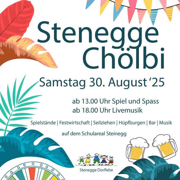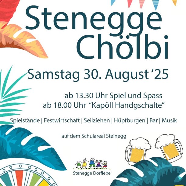 Liebe alle! Danke für eure tatkräftige Unterstützung für das neue Glücksrad, welches erstmals an der Chölbi 2025 im Einsatz stand. Das Projekt ist ein voller Erfolg. Die Chölbi war auch dieses Jahr mit diversen Spielen, Hüpfburgen, dem Seilziehturnier, der Festwirtschaft und den flott aufspielenden „Handgschaltete“ eine gelungene Sache! Tausend Dank den vielen Helfenden. Wir freuen uns auf eine Neuauflage im 2026. Euer Ok Stenegger Dorflebe