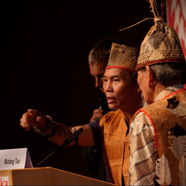 Auf dem Photo ist Mutang Tuo zu sehen. Er sagt als Zeuge vor dem Basler Regenwald-Tribunal aus. Er und Unga Paren, ebenfalls ein Hauptprotagonist meines Kurzfilmes, bereisten 1990 mit Bruno Manser und Mutang Urud anlässlich der "Penan World Tour" innert sechs Wochen 25 Städte in 13 Ländern, um auf die bedrohliche Abholzung des Regenwaldes aufmerksam zu machen. PS: jetzt sind schon 2283 fr. zusammengekommen. Freue mich auf weitere Spenden! Vielen Dank Oliver Marti