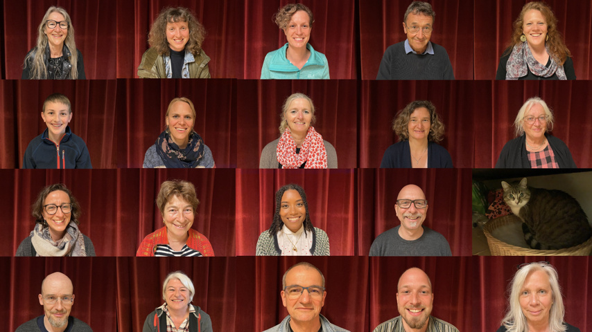 Leute zusammen, vor, hinter und auf der Bühne. Unser Team möchte