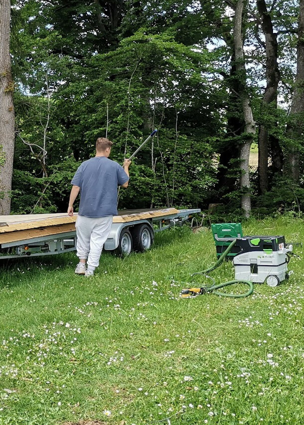 Mit Distanz-hölzern, Distanzschrauben, einem Fugenband und dem Handhobel haben Virginia und ich (Rémy) das letzte Fensterelement für den Nomadcube in Niedermuhlern gebaut. In der Zwischenzeit hat Jarou die Bodenelemente angeschliffen und im Anschluss lasiert.