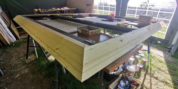 Um das Dach abzudichten verwenden wir eine Teichfolie. Diese müsste 8000mm x 3000mm x 1mm gross sein.