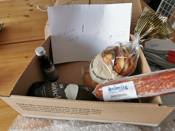 Guten Morgen alle zusammen! Die Spezialitäten aus Einsiedeln sind bereits unterwegs! Erfreut euch an lokaler Wurst, Bier, Schnaps und Gebäck ;-). Auch alle anderen Merci's bin ich fleissig am vorbereiten mit meinem Team, damit ihr diese baldmöglichst erhaltet. Nochmals grossen Dank an euch alle und einen guten Wochenstart! Sportliche Grüsse, Philipp & das TRE Team.