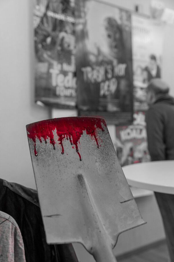 Photo personnalisée avec le réalisateur et/ou l'acteur principal (Ash) avec la pelle, objet mythique du court métrage, à utiliser dans une mise en scène horrifique.