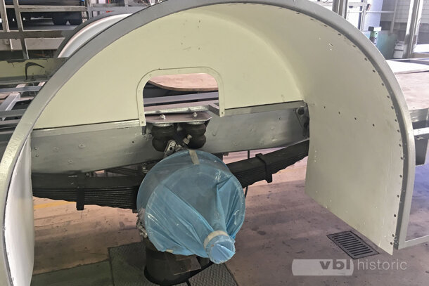 Auch über die Feiertage ruhten die Arbeiten am Oldtimerbus Nr. 81 nicht: Die Radkästen hinten wurden in dieser Zeit eingebaut und bis Anfang dieser Woche wurden weitere Reparaturen am Zwischenchassis im Bereich der Vorderachse durchgeführt.