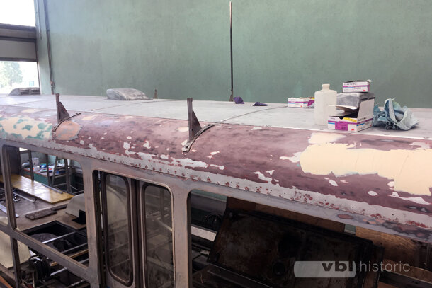 Umso mehr freut es uns, dass es nun weiter geht. In den vergangenen Tagen wurde das Dach für die anstehende Lackierung vorbereitet, wie auf den Bildern zu sehen ist. Noch diese Woche soll der obere Teil unserer Nr. 81 mit einem frischen silbernen Lack versehen werden.