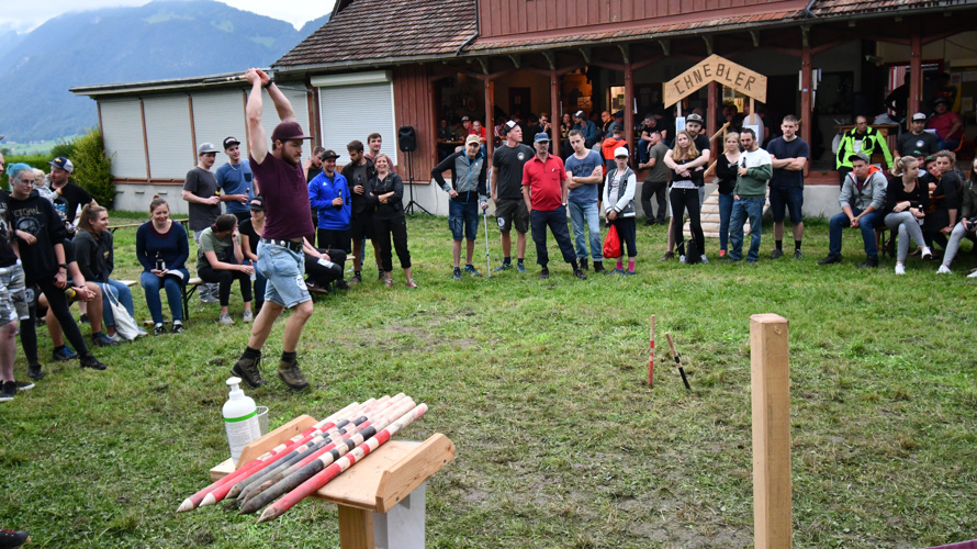 Beim Chneblä werden gespitzte Holzpfähle – die sogenannten Chnebel – mit kräftigem Wurf in den Boden gerammt. Danach geht es sprichwörtlich „ums Leben“: Mit gezielten Würfen versuchen die Teilnehmer, die Chnebel der Gegenspieler aus dem Boden zu schlagen, um ihnen Punkte abzuziehen.