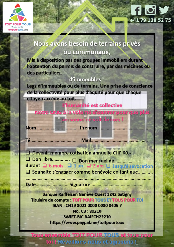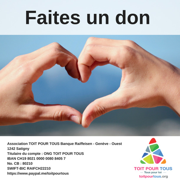 Un modèle humaniste pour l'édification de notre prochain. Permettre un toit à ceux sans domicile sur le Canton de Genève. Association caritative à but non lucratif. Permettre l'accès au toit à ceux sans domicile sur le modèle innovant du housing first. Un toit pour ceux qui n'en ont pas. Des dispositifs d’habitats relais ouverts toute l’année. www.toitpourtous.org Soyez nombreux à contribuer à ce modèle. FAIRE UN DON : Association TOIT POUR TOUS Banque Raiffeisen - Genève - Ouest 1242 Satigny Titulaire du compte : ONG TOIT POUR TOUS IBAN CH19 8021 0000 0080 8405 7 No. CB : 80210 SWIFT-BIC RAIFCH22210 https://www.paypal.me/toitpourtous Grâce aux dons privés uniquement, nous pouvons continuer cette action citoyenne et humaniste. Nous vous remercions et vous en sommes très reconnaissants.