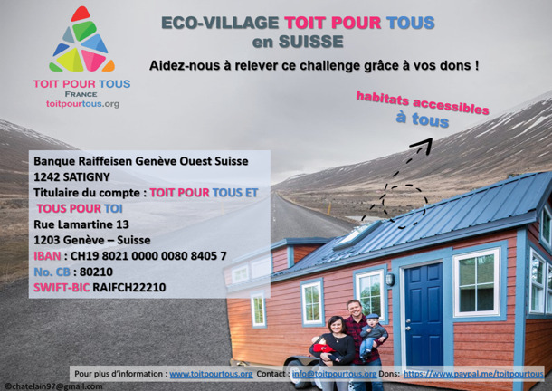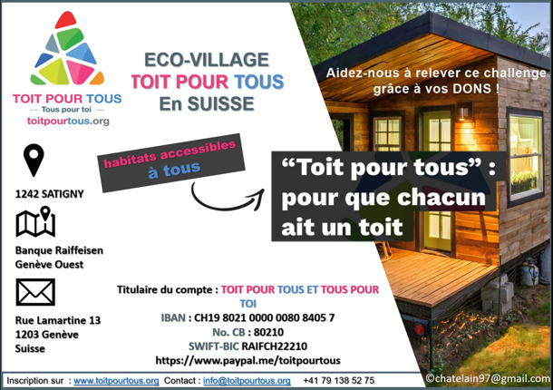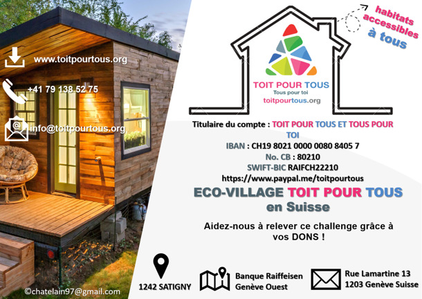 Appel à une pluie de dons pour la concrétisation du 1er éco-village TOIT POUR TOUS à Avusy à Genève. 5 maisonnettes pourront accueillir des personnes et familles sans domicile. Aidez-nous grâce à votre contribution à la réussite de de modèle à innovation sociale et solidaire.
