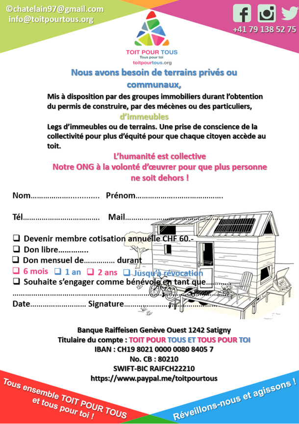 Nous avons besoin de vous ! Chacun peut contribuer à son niveau. Parlez-en autour de vous. Faîtes-nous partager votre réseau. Nous souhaitons rencontrer des élus. Si vous avez le coeur de nous aider, sachez que l'intention est ce qu'il y a de plus fort ! Merci de votre aide et soutien. www.toitpourtous.org FAIRE UN DON : TOIT POUR TOUS Banque Raiffeisen - Genève - Ouest 1242 Satigny Titulaire du compte : ONG TOIT POUR TOUS IBAN CH19 8021 0000 0080 8405 7 No. CB : 80210 SWIFT-BIC RAIFCH22210 https://www.paypal.me/toitpourtous Grâce aux dons privés uniquement, nous pouvons continuer cette action citoyenne et humaniste. Nous vous remercions et vous en sommes très reconnaissants.