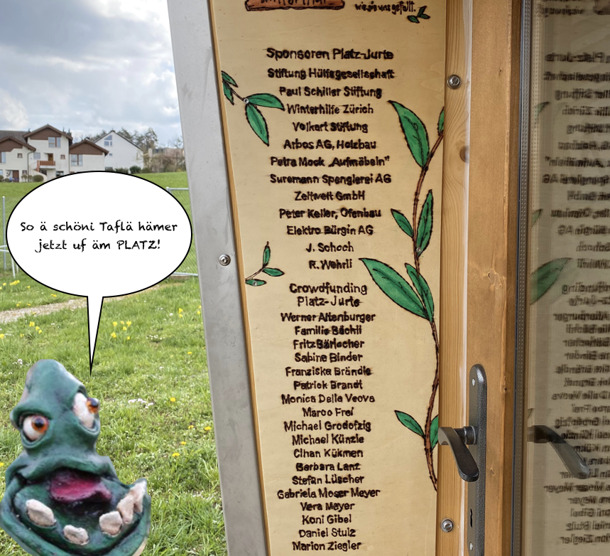Liebe PLATZ-Fans Es ist soweit! Ab einer Spende von CHF 150.- konnte man als Merci seinen Namen auf einer Tafel verewigen lassen. Diese hängt nun direkt beim Eingang der Jurte. Liebe Grüsse vom PLATZ-Team