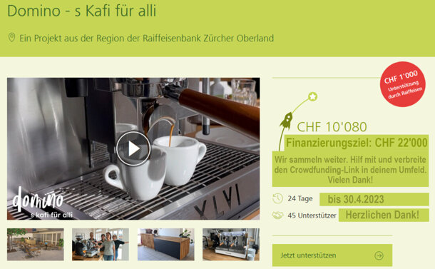 Wir sind sehr dankbar: Innert knapp 2 Wochen haben wir die 1. Finanzierungsschwelle geschafft. Mit und dank euch - 45 Unterstützende und 100 Fans. Nun bleiben uns 24 weitere Tage, um auch das Finanzierungsziel von 22'000 Franken zu errreichen. Bitte helft nochmals mit, dass möglichst viele Menschen von der Vision des Kafi Domino erfahren, sie weitererzählen und unterstützen. Herzlichen Dank! Wir wünschen euch gesegnete Ostertage - es ist das Fest der Hoffnung und Freude. Diese Hoffnung und Freude ist es, die uns als Domino-Projektteam motiviert und erfüllt.