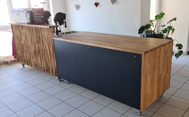Natürlich steht die Steamhammer nicht einfach am Boden rum, sondern auf der wunderschönen Theke, die Timon von TEIMI HOMES uns gebaut hat. Es war ein langer Weg von den ersten Ideen zum finalen Ergebnis, das sich bereits bestens bewährt hat. Denn ...