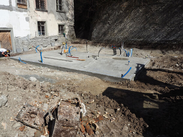Auf dem ersten Foto sieht man Maurus beim Betonieren, zusammen mit den Arbeitern der Firma Hans + Martin Hasler Bau AG. Auf dem zweiten Bild ist Daniel Berger, links in weissem T-Shirt, bei der Arbeit zu sehen und im Vordergrund die Überreste eines kleinen Kachelofens, der beim Abbruch in den 70er Jahren mit in den Boden gewandert und nun wieder zu Tage gekommen ist.