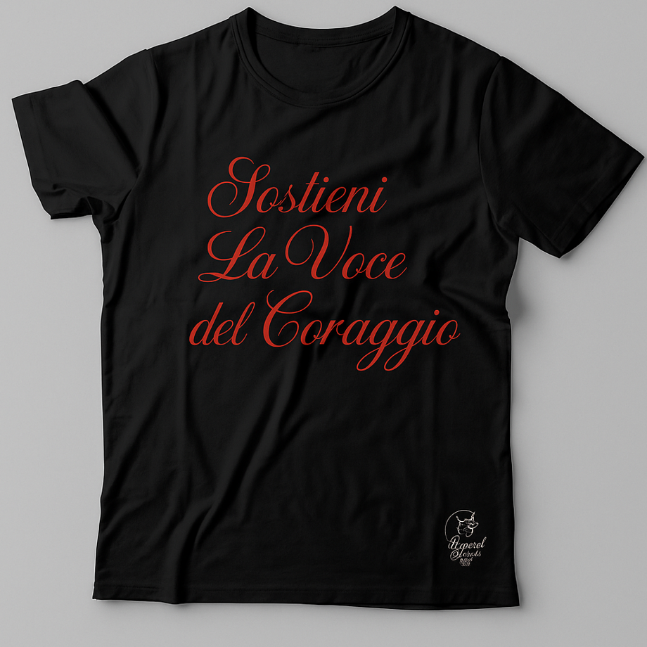 Magliette con frasi d’impatto, come “Sostieni la voce del coraggio”, per diffondere il messaggio durante eventi o campagne.
