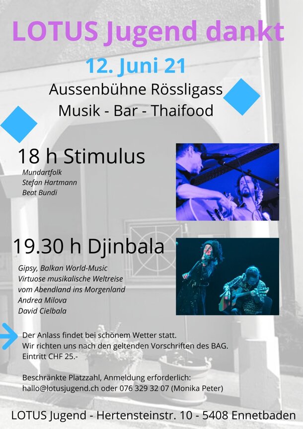 Liebe Freunde und Freundinnen vom LOTUS Teens-Club - Wir freuen uns, dass die Finanzierung erfolgreich abgeschlossen ist. Dafür möchten wir euch allen ganz herzlich danken. Wir danken mit Musik, Getränken und feinem Thai-Essen. Unter den Arkaden haben wir eine Aussenbühne eingerichtet und freuen uns auf einen stimmungsvollen Abend. Bitte meldet euch an, da die Platzzahl beschränkt ist. Herzlich Monika