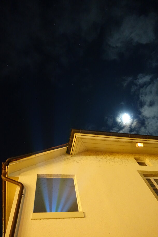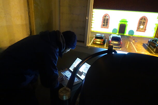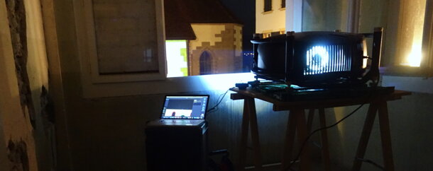 Beim ersten Test vor Ort hat alles wunderbar geklappt. Bei eisigen Temparaturen haben wir die Platzierung des Beamers ausprobiert und erste Bilder auf die Fassade der französischen Kirche angepasst. Andreas konnte sogar per Facetime aus Amerika dabei sein.