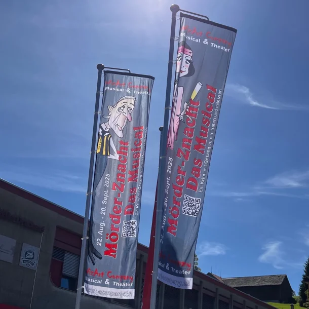 Ein grosser Moment Seit diesem Wochenende flattern zwei Fahnen in Herisau gut sichtbar und weisen auf unser Musical hin.Der Butler und eine ehrenwerte Gästin grüssen freundlich bei der Appenzeller Druckerei. Vorbei spazieren, QR Code anpeilen und Tickets buchen...so einfach kann es gehen. Wir freuen uns sehr, dass unser Musical nun für viele sichtbar beworben wird. Sogar Petrus war uns wohlgesinnt und strahlt mit der Lady um die Wette.