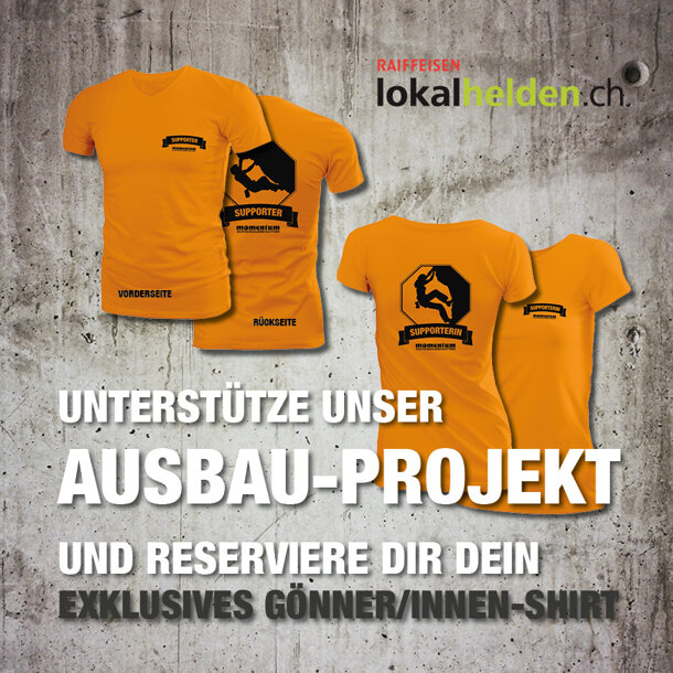 Hallo liebe Fans des Ausbauprojekts des Momentums in Olten. Heute ein kurzer Zwischenstand und ein Hinweis auf die neuen Gönner Shirt-Designs. Wir sind nach 2 Wochen bereits bei 58 Unterstützern und einer Summe von 8'640 CHF angekommen. Das stimmt hoffnungsvoll. Vielen Danke an alle! Doch noch fehlt etwas mehr als die Hälfte, um den Ausbau realisieren zu können. Als eine mögliche Unterstützung, um die Botschaft weiter zu tragen, findet ihr in diesem Post unser Design für die Gönner Shirts. Wir hoffen, Ihr findet sie wunderbar und macht Werbung für unser Projekt in Eurem Umfeld (z.B. auf Social Media oder persönlich). Nach dem Motto: Wir alle gemeinsam sind das Momentum und das Momentum wächst mit uns! Viele Grüsse von Tobi, Alex und dem ganzen Momentum-Team