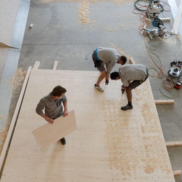 Die Zeit der Planung hat ein Ende und so hat sich das Momentum in den letzten Tagen in eine Baustelle verwandelt. Mit einem Sattelschlepper voll Material (inkl. über 10m langen Balken) hat die intensive Zeit für das Bau-Team am Mittwoch begonnen und wird bis zum 12. April anhalten, wenn am Ende noch die Matten geliefert und installiert werden.