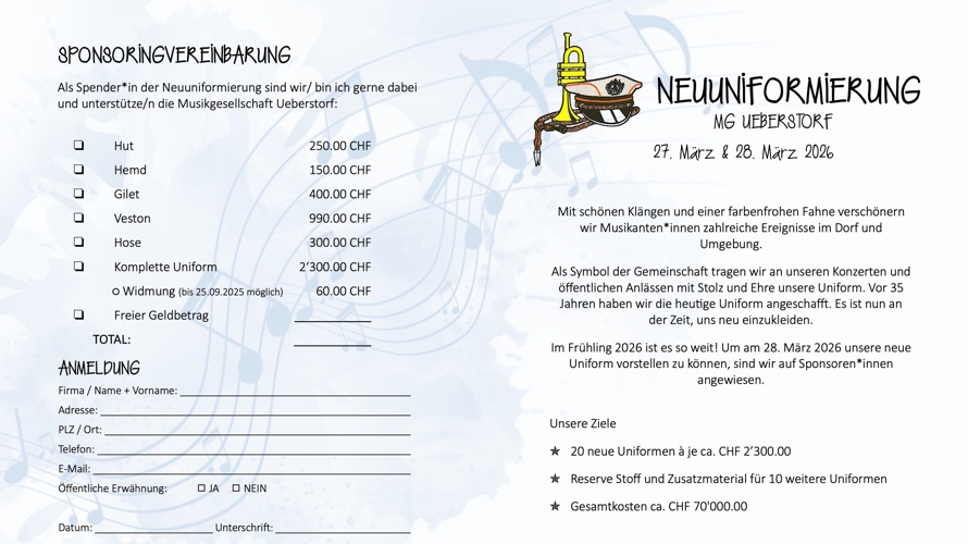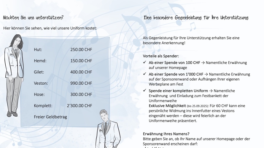 Wollen Sie uns unabhängig von unserem Projekt Neuuniformierung unterstützen, fliesst Ihr Beitrag in die Förderung junger Musikanten*innen. Zudem unterstützen Sie uns bei der Ausübung und Aufrechterhaltung der musikalischen Tradition im Dorf und Umgebung.