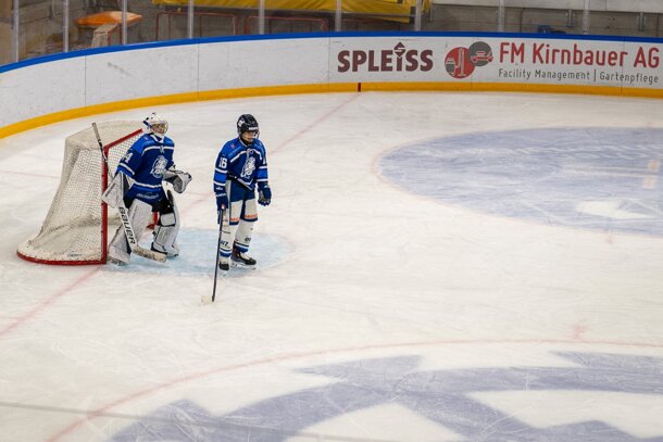 Auf dem Bild bin ich (Nr. 16) mit einem unserer zwei Goalies zu sehen, wie ich den Slot verteidige.