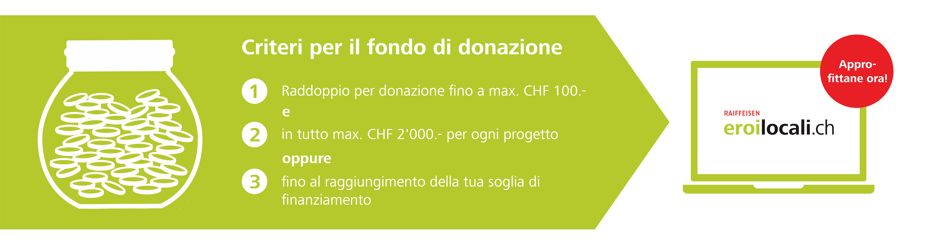 Raiffeisen contribuisce con al massimo CHF 1'000.- per ogni progetto di crowdfunding. Per ogni donazione Raiffeisen raddoppia l'importo, con un massimo per ogni sostenitore/sostenitrice fissato a CHF 100.-. Il supporto del fondo di donazione termina non appena è stata raggiunta la soglia di finanziamento del tuo progetto o il fondo di donazione è esaurito. Sulla nostra piattaforma gratuita vale il principio «first come, first served».