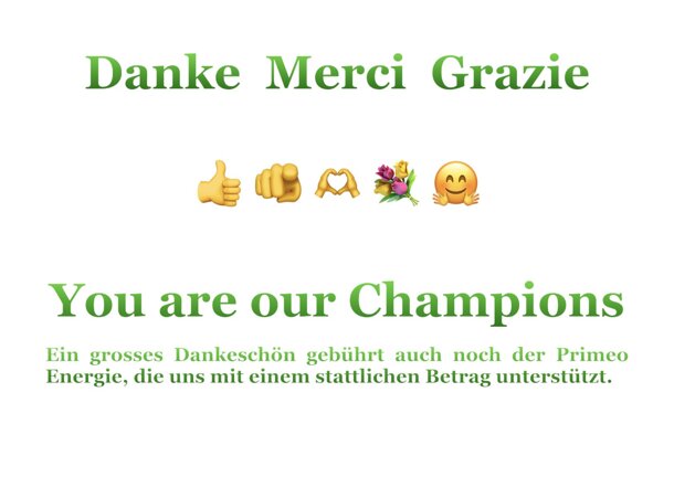 Danke Merci Grazie Liebe Fans und Spender - Ihr seid die Grössten. Das Projekt ist Gestern um 23.59 zu Ende gegangen - als voller Erfolg. Wir haben das Euch und Eurem sensationellen Einsatz zu verdanken. ❤️❤️❤️ Das Wunschziel ist erreicht, weil im letzten Moment noch mehrere von Euch erneut gespendet haben. In diesem Portal aus technischen Gründen nicht ersichtlich, sind die 14'000 Franken Realität geworden! Wir sind hoch erfreut zu realisieren, wie breit die Unterstützung in der Region verankert ist - einfach grossartig.
