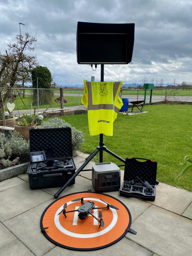 Mittlerweile konnte ich mit der Beschaffung, bzw. der Vervollständigung des Einsatzmaterials diese Projektphase auch abschliessen. Der zur Verfügung stehende Geldbetrag ermöglichte die Anschaffung eines qualitativ hochstehenden Equipments, bestehend aus einer Drohne mit Wärmebildkamera, Ersatzakkus, einem Feldmonitor, Funkgeräte, sowie diversem Kleinmaterial (Foto anklicken). Die Basis für eine erfolgreiche Saison ist somit gelegt. Anfang Januar 2024 begann mit der Ausbildung zum Drohnenpiloten der Rehkitzrettung die dritte und letzte Projektphase. Diese wurde soeben mit einer theoretischen sowie einer praktischen Prüfung abgeschlossen. :-) Mitte April beginnt dann die spannende Saison der Rehkitzrettung.