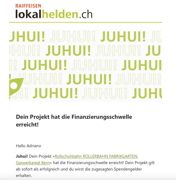Liebe Fans, Freundinnen und Unterstützer der ROLLERBAHN FABRIKGARTEN WOOO-HOOOO!!! Wie cool war das, als ich vor ein paar Tagen diese Nachricht hier (aufs Bild klicken) per Mail erhielt!! Nochmals 1000-Dank an alle, die uns unterstützen!!! Ohne euch wäre das gar nicht möglich. Wir sind froh zu sehen, dass das Projekt auf so viel Unterstützung stösst. Was uns auch freut, ist dass noch immer weitere Spenden aus den verschiedensten Ecken eingehen. Die Kampagne läuft noch 10 Tage - 10 Tage um unseren Zielbetrag zu erreichen. Wer noch nicht gespendet hat und das noch gerne tun möchte hat also noch etwas Zeit. Und weiterhin dürft ihr gerne weitersagen, was bald im Fabrikgarten auf dem Gaswerkareal los sein wird (siehe Video, z.B.). Und dass es losgeht ist jetzt sicher - DANK EUCH!! NOCHMALS EIN HERZLICHES MERCI, IHR HÖRT VON UNS