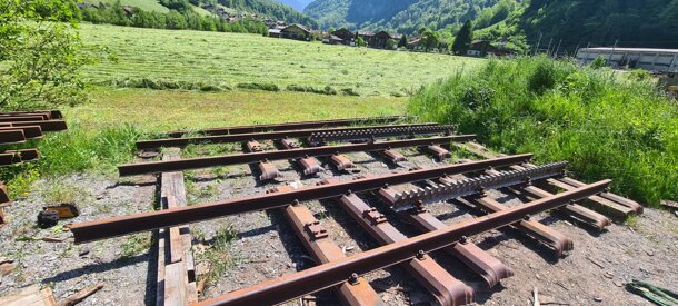 ...schliesslich soll der Wagen angemessen präsentiert werden. Da Gleis und Wagen " indoor " aufgestellt werden, müssen die Schienen von Holzschwellen auf Stahlschwellen ummontiert werden. Und obwohl der Wagen nicht mit Zahnrad ausgerüstet ist, wird natürlich ein Stück Zahnstange zur Illustration angebracht, damit es " e Gattig macht ". Das Wetter ist uns wohlgesonnen, so dass die Arbeit wahrlich eine Freude macht im Berner Oberland. Vielen Dank für die bisherige Unterstützung. Wir freuen uns riesig!