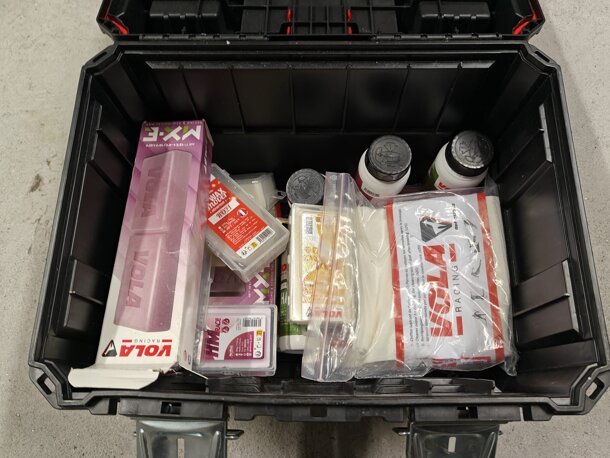 Sa boîte à outils contenant tout ce qu'il faut pour entretenir ses lattes: lime en diamant, machine pour les carres, farts…