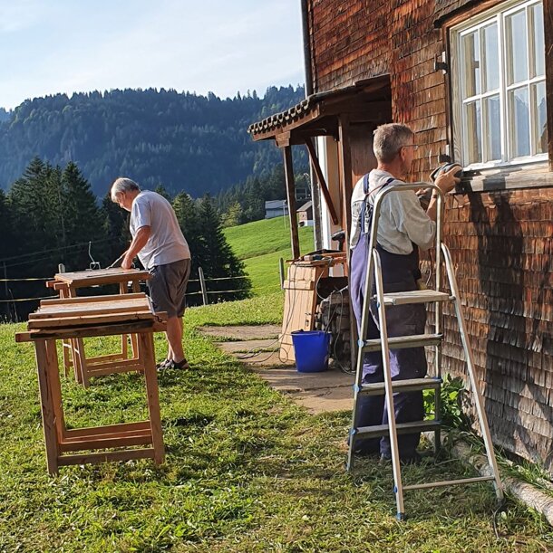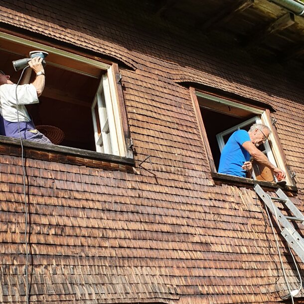 Reini und Rolf kümmerten sich um den Rest der Läden und schabten und schliffen die blätternde Farbe weg. Danach imprägnierten Sie die Stellen an denen das Holz zu sehen war.