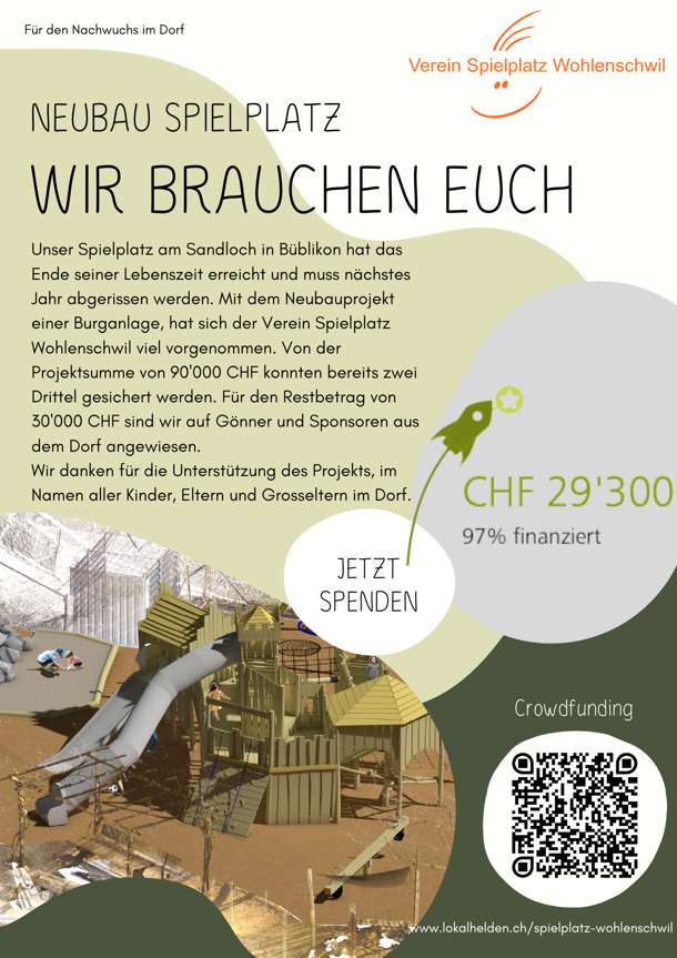 Liebe Fans und Unterstützer, wir haben noch rund 8 Tage Zeit und sind mit der Spendensammlung auf gutem Kurs. Jetzt geht es an den Endspurt um unsere Finanzierungsschwelle zu erreichen und allenfalls sogar die Nestschaukel auch zu ermöglichen. Wir sind froh wenn ihr unser Projekt im Freundes- und Bekanntenkreis weiter teilt . Wir danken für eure Unterstützung! Der Vorstand des Spielplatzvereins Wohlenschwil