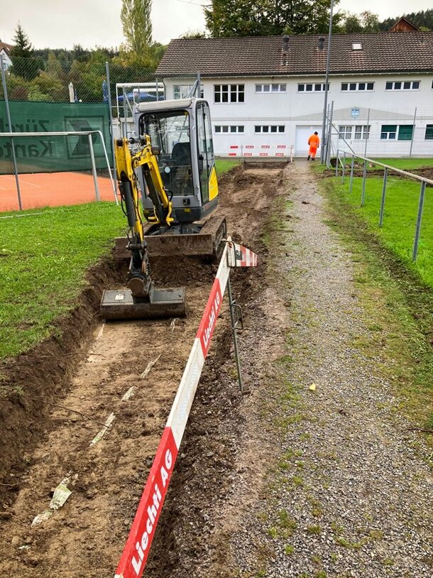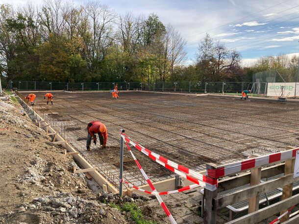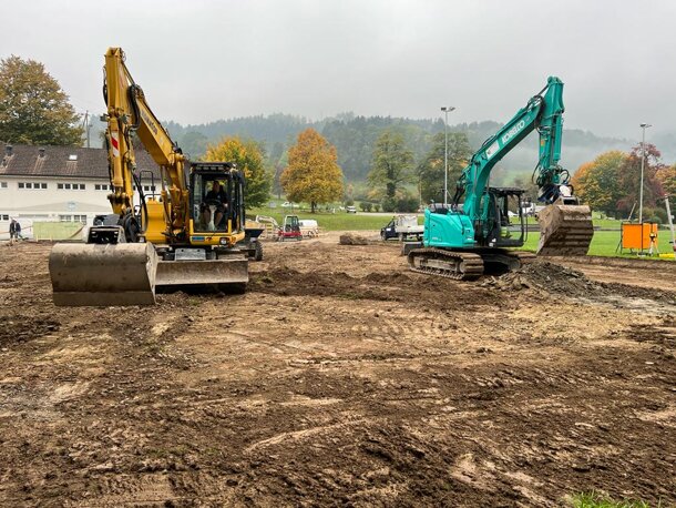Liebe Fans und Unterstützer, Gute Neuigkeiten von der Baustelle - die Arbeiten laufen in KW 41 auf Hochtouren - Fläche abhumusiert, genaue Höhen bestimmt, Aushub bis auf Sohle im Innenbereich erstellt, Magerbeton im Innenbereich erstellt, Dachwasserschacht versetzt und angeschlossen, Pumpenschacht für Kanalisation geliefert, versetzt und angeschlossen, Wasseranschluss vom Garderobengebäude sind erstellt. Es läuft...