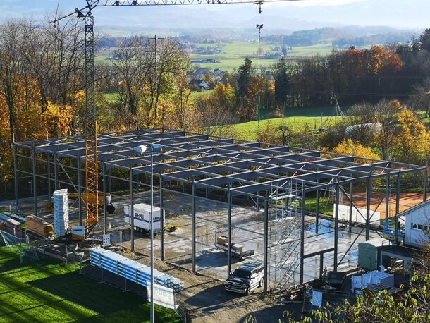 Langsam biegen wir auf die Zielgerade ein, es fehlen «nur» noch CHF 13'130. Jetzt bitte nicht nachlassen, denn nur wenn wir auch diesen Betrag noch stemmen erhalten wir den Spendenbetrag! «Die Halle nimmt Form an». In dieser Woche (KW46) wurde der Stahlbau aufgerichtet. Dieser dient als Skelett für das Dach mit der Dämmung, Begrünung und Photovoltaikanlage und auch für die Fassadenelemente welche die Sportler:Innen später vor Wind und Wetter schützen. Total wurden 73 Tonnen Stahl verbaut. Das schwierigste war sicherlich die knappen Platzverhältnisse. Auch hier konnten wir auf das das lokale Gewerbe zurückgreifen. Die Volz Bäume AG aus Hinteregg hat den idealen Pneukran zur Verfügung gestellt, um die knapp 6 Tonnen schweren und 24,5 m langen Hauptträger zu versetzen. Ab Mitte nächster Woche werden die Dachbleche geliefert und verlegt, so das es bald trocken ist in der Halle!»