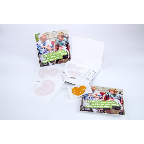 Das heutige "Merci" - 1 Kinderlachen & Herzpflaster Die Herzen, die heilen helfen. Etui mit 6 orangenen Herzpflastern, ideal zur Versorgung kleiner Wunden. Zaubern jedem Kind ein Lächeln auf die Lippen! Limitierung: 10 Stück. SOLIDARITÄTSPAKET Mit den 25.- schenken Sie 1 Kinderlachen Für die 5.- erhalten Sie ein Herzpflaster-Etui aus dem Theodora-Webshop Der Erlös der Webshopartikel fliesst ebenfalls in die Kernmission der Stiftung Theodora. _______________________________________________________________ Le „merci“ d’aujourd’hui – 1 sourire à un enfant hospitalisé et un étui en carton contient 6 sparadraps orange en forme de cœur Idéals pour panser les petits bobos, ces sparadraps redonnent le sourire aux enfants. L’étui en carton contient 6 sparadraps orange en forme de cœur : 3 grands et 3 petits. Limité 10 pièces. PAQUET DE SOLIDARITÉ Avec 25.- vous offrez des sourires à un enfant hospitalisé Pour 5.- vous recevez un étui avec des cœurs sparadraps Le montant de la vente de l’article de la boutique en ligne sera versé également pour la mission principale de la Fondation Théodora.