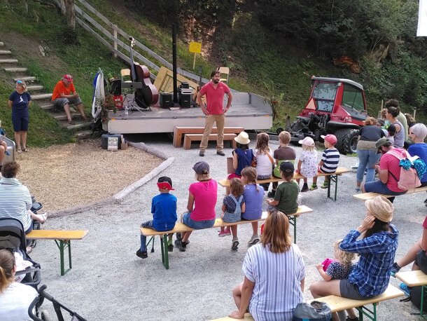 Linard Bardill eröffnete das Fest mit tollen Liedern. Das Publikum sang begeistert mit und die Kinder tanzten auf und neben der Bühne. Danach verwöhnten uns die Landfrauen von Tenna mit einem reichhaltigen Mittagessen und einem super Kuchenbuffet! Am Nachmittag konnten sich die Kinder an den verschiedenen Energieposten kreativ betätigen und sich auf einen interessanten Rätselweg begeben. Wer Lust hatte konnte sich schmicken lassen, die Esel streicheln oder auf den Pferden reiten. Es hatte für jeden und jede etwas dabei.