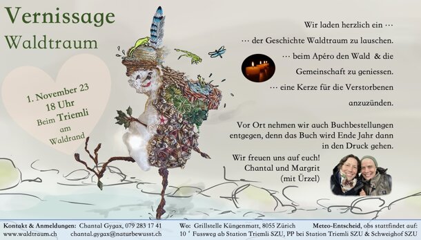 Liebe Crowd! Gerne möchten Margrit Egger und ich den 1. November nutzen, um zusammenzukommen, um die Geschichte Waldtraum ein erstes Mal in die Welt zu tragen und gleichzeitig auch dem Datum entsprechend, den Verstorbenen in einer lichtvollen Waldatmosphäre zu gedenken. Deshalb: Wir laden herzlich ein … … der Geschichte Waldtraum zu lauschen. … beim Apéro den Wald, die Gemeinschaft & das wärmende Feuer zu geniessen. … eine Kerze für die Verstorbenen anzuzünden. 1. November 2023 18.00 Uhr Grillstelle Küngenmatt (Waldrand bei der SZU Station Triemli) Vor Ort nehmen wir gerne auch Buchbestellungen entgegen, denn das Buch wird Ende Jahr dann in den Druck gehen. Kinder sind natürlich herzlich willkommen. Auf dem Flyer sind alle wichtigen Infos enthalten, er ist auch auf der Homepage Waldtraum zu finden. Der Meteo-Entscheid fällt am 31. Oktober 2023, ob die Vernissage im Wald stattfinden wird. Wir informieren dazu auch hier: www.waldtraum.ch Bitte meldet euch bei Chantal an, Anmeldeschluss ist der 25. Oktober 2023 . Wir freuen uns auf alle, die zu uns in den Wald kommen! Chantal und Margrit (mit Ürzel, der um die Wette leuchten wird)