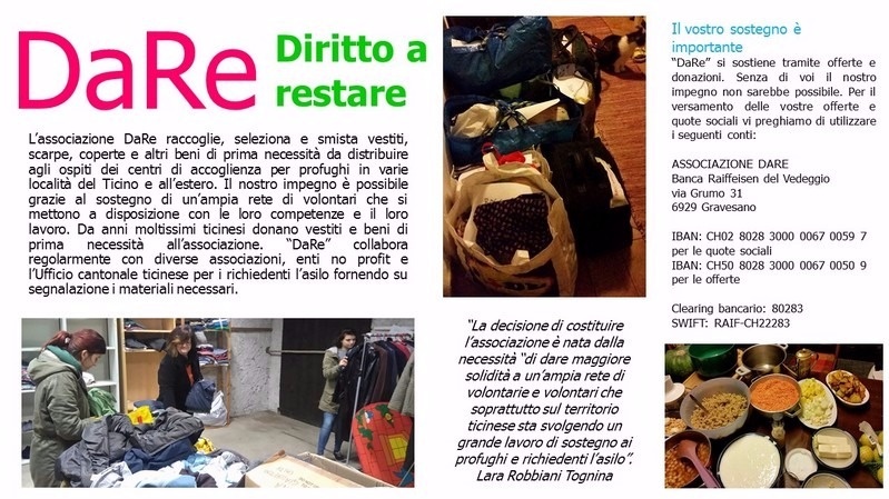 Buon anno! Grazie di averci sostenuto e condiviso la ricerca di fondi. Purtroppo non abbiamo raggiunto la somma indicata, per cui, se volete sostenerci, dovreste versare direttamente sul conto DaRe. Associazione DaRe Banca Raiffeisen del Vedeggio via Grumo 31 6929 Gravesano IBAN: CH02 8028 3000 0067 0059 7 per le quote sociali IBAN: CH50 8028 3000 0067 0050 9 per le offerte Clearing bancario: 80283 SWIFT: RAIF-CH22283