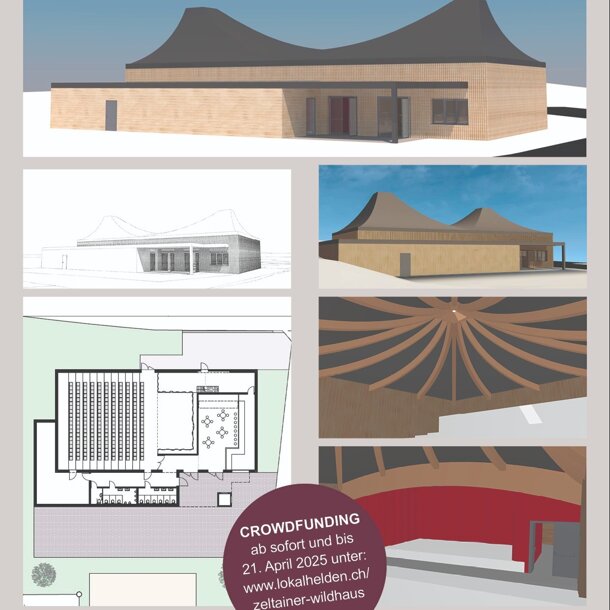 Das Highlight im Neubau wird die Dachkonstruktion sein. Blumer Lehmann konstruiert das geschwungene Dach angelehnt an das alte Zelt (siehe Foto). Für 100.- gehört dir ein Laufmeter davon. Dankeskarte inklusive.