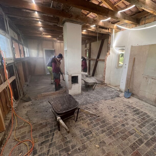 Wir möchten euch zum Ende des Jahres einen kurzen Überblick vom grössten Bauprojekt der Pfadi Patria der letzten Jahrzehnte geben. Seit November waren zahlreiche Helfer*innen unter der Leitung von Tabasco und Orion jedes Wochenende auf dem Hartlisberg um so viel wie möglich für das Umbauprojekt der Küche zu leisten. In den gesamthaft über 300 freiwillig gearbeiteten Stunden konnte schon sehr viel erreicht werden: Zuerst wurde die alte Küche ausgeräumt, Geschirr sortiert und eingelagert. Danach wurde ein Küchengerät ums andere aus der Küche getragen, die Schränke wurden abgebaut und alle Wasserleitungen, Armaturen und die ganze Elektronik entfernt. Als nächster Schritt wurden die Deckenplatten, die Vertäferung und mehrere Wände entfernt. Plötzlich fanden wir uns in einem grossen Raum wieder, welcher eine Vorschau auf die neue, geräumige Küche zulässt. Gegen Ende November wurde ein alter Kamin in der Mitte des nun grossen Raums abgebaut. Zudem wurde der alte Bodenbelag entfernt, eine Staubschutzwand zum angrenzenden Schlafzimmer und ein Bauprovisorium mit praktischen Rampen, einem Pausenraum und funktionierender Stromversorgung eingerichtet. Im Dezember kam zum ersten Mal eine Baufirma ins Pfadiheim. Sie stützten einen Dachbalken und entfernten dann die tragende Wand. Der anfallende Schutt wurde dann durch uns am Wochenende mittels unzähligen Schubkarrenladungen zur Mulde transportiert. Insgesamt kamen seit Beginn der Abbrucharbeiten drei ganze Mulden voller Schutt zusammen. Bei den bisher geleisteten Arbeiten waren von A wie Altpfader über W wie Wölflileiterin bis Z wie (Profi!)- Zimmermann viele aus der Patria dabei. Wir sind stolz auf diese Leistung und freuen uns aufs neue Jahr und vor allem auf den Ausbau und die baldige Eröffnung der Küche im Frühling 2025. Damit wir unser Ziel bis zum 12. Januar 2025 erreichen, brauchen wir nun noch Hilfe! Ein grosser Brocken fehlt noch bis zum Mindestbetrag. Daher: Erzähle allen fleissig vom Projekt, so dass wir dieses auch erfolgreich abschliessen können. Ein grosses M-E-R-C-I. Und ä guete Rutsch!